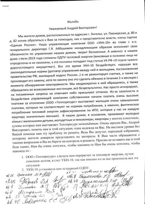 Мы жители домов, расположенных по адресам г. Энгельс, ул. Пионерская, д. 80 и д. 82 хотим обратиться к Вам за помощью, как к представителю власти, члену партии «Единая Россия». Наша управляющая компания ООО «УКН-10» во главе с и.о. генерального директора Г.Я. Айбушевем ненадлежащим образом исполняет свои обязанности по управлению нашим домом, творит беззаконье. А именно: в нашем доме с осени 2019 года сломаны ОДПУ тепловой энергии (виновные в поломке лица не определены и не наказаны, а эта поломка попадает под статью УК РФ «О порче чужого дорогостоящего имущества»). Все это время УКН-10 бездействует, нарушая все законодательные нормы (договор управления между ней и жильцами, постановления правительства РФ, жилищный кодекс России…) и не ремонтирует счетчик, а также не производит его замену, хотя по закону оно это сделать обязано в течении 2-х месяцев с момента обнаружения неисправности. Мы неоднократно к ней обращались, а также обращались во всевозможные инстанции, всё безрезультатно. Нас просто игнорируют, на письменные запросы не отвечают либо присылают отписки. Из-за халатности и бездействия управляющей компании собственники начали платить очень высокие платежи за отопление (ООО «Теплоресурс» выставляет жильцам очень завышенные платежи, которые не соответствуют не нормам потребления, а именно, фактическое потребление тепловой энергии зафиксированное по ИПУ, которые у нас на каждую квартиру значительно меньше). В наших домах, в основном, проживают молодые семьи с маленькими детьми, могодетные и пенсионеры, квартиры у многих в ипотеках, суммы которые нам выставляет Теплоресурс неподъёмные. Очень просим Вас, Андрей Викторович, помочь нам в этой ситуации, одна надежда на Вас. На местном уровне без Вашей помощи нам эту проблему не решить. Ведь Вы депутат, народный избранник, которому жители доверили представлять их интересы. К Вам часто обращаются с такими вопросами и Вы их берете на контроль и решаете. Просим не оставить нас в этой беде одних. Нам бы очень хотелось, чтобы наконец-то Нам бы очень хотелось, чтобы наконец-то :