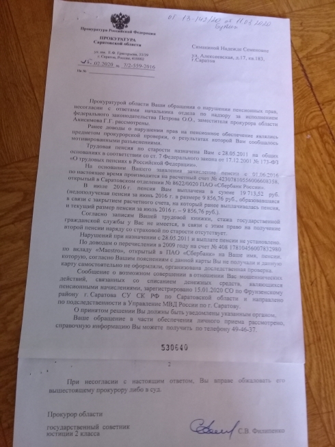 Однако, получила письмо от 25.02.2020г №7/2-559- 2016 ? (копию прилагаю) за Вашей подписью, которое не по существу моего дела, Факты искажены. Есть подозрение, либо Вас ввели в заблуждение, либо подпись скопировали??? Не хочется верить, что подписали безз проверки обстоятельств дела.
