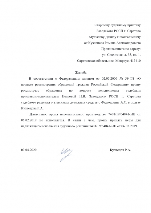 В соответствии с Федеральным законом от 02.05.2006 № 59-ФЗ «Опорядке рассмотрения обращений граждан Российской Федерации» прошу рассмотреть обращение по вопросу неисполнения судебным приставом-исполнителем Петровой П.В. Заводского РОСП г. Саратова судебного решения о взыскании денежных средств с Федюшкина А.С. в пользу Кузнецова Р.А.