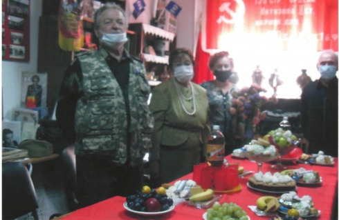 Завершилась встреча чаепитием со сладостями, всякими вкусностями за столом в ветеранской гостиной. Баянист сидел поодаль и играл молодежи наши любимые песни. Расселись на расстоянии друг от друга, как и положено сейчас, угощались и продолжали разговаривать (хоть в масках) о жизни, об учёбе, о мечтах, о родителях и бабушках.