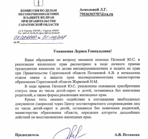 Я, Петина Юлия Сергеевна, прошу провести проверку и восстановить мои права на жилое помещение, которое закреплено за мной Постановлением Администрации Ленинского района г.Саратова.
