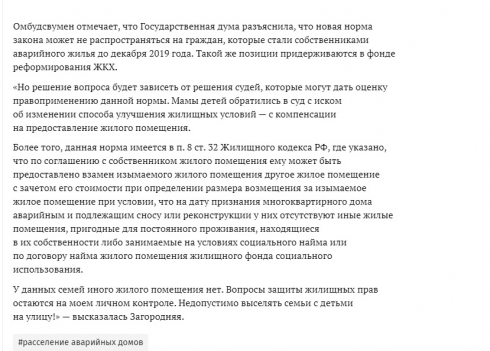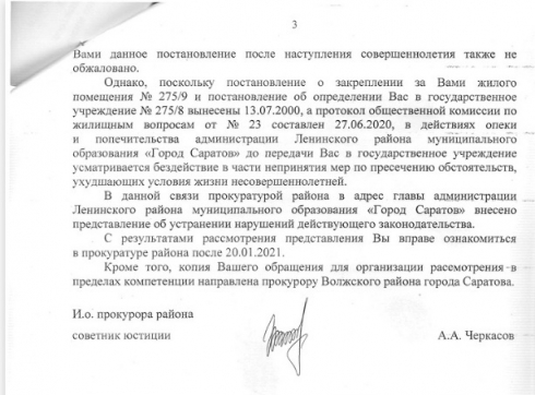 В данном случае с выселением несовершеннолетних из приобретённого жилья, ВОЗМОЖНО, также усматривается нарушение их прав органами опеки Заводского района, поэтому я не согласна с тем, что восстановление прав несовершеннолетних и их мам на жильё возлагается только на судебные инстанции без привлечения СУ СК РФ.