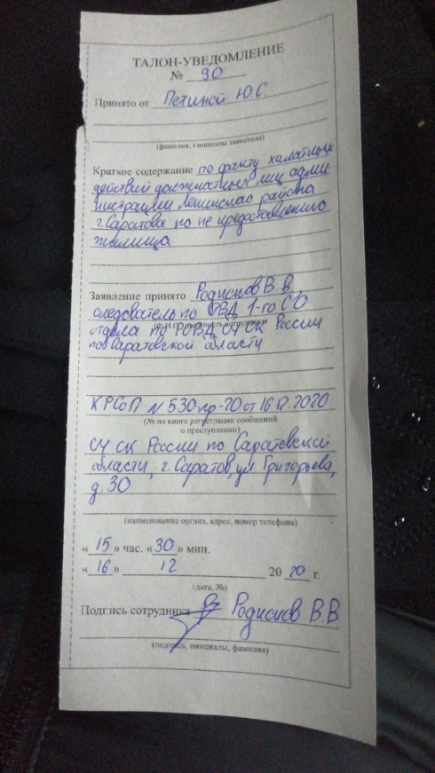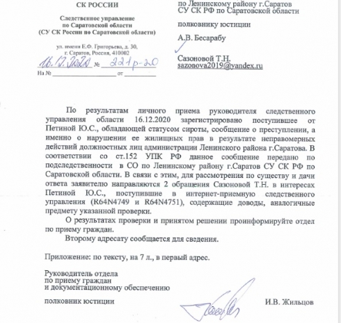 Огромное спасибо руководителю СУ СК РФ по Саратовской области Говорунову Анатолию Юрьевичу за неравнодушие к правам сироты и за личный приём 16.12.20202 Петиной Ю.С., а также руководителю отделу по приёму граждан и документационному обеспечению Жильцову Илье Владимировичу за то, что на высоком профессиональном организовал личный приём.