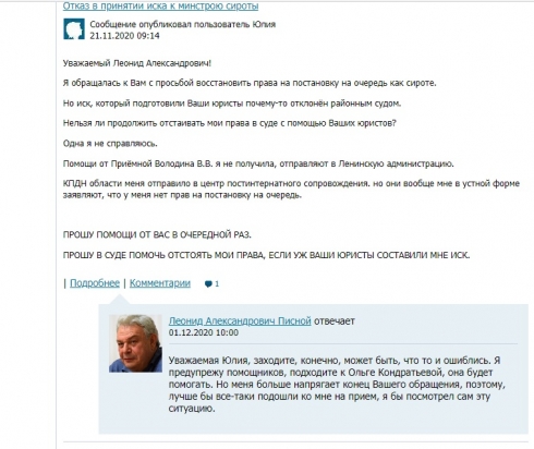 Комментарии уважаемого депутата Писного Л.А. , на мой взгляд, не относятся к ситуациямЮ в которых задействованы органы опеки и попечительства. Более того, его юристы ПИСНОГО Л.А. составили Петиной Ю.С иск к минстрою, который отклонил суд, так как иск должен был быть к Администрации Ленинского района и по абсолютно другим основаниям. Ответ Писного Л.А. от 01.12.2020 года в "Лицах губернии " приложен.