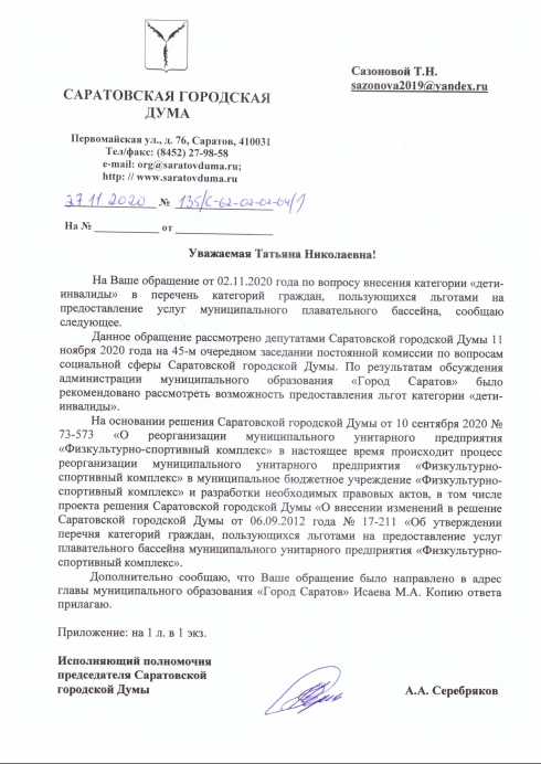 Сегодня 29.12.2020 года ВАШ ЗАМЕСТИТЕЛЬ Бурмак А.В., член партии ЕР , прислал ответ на обращение, в котором обещает 50% скидку для детей на посещение бассейна.