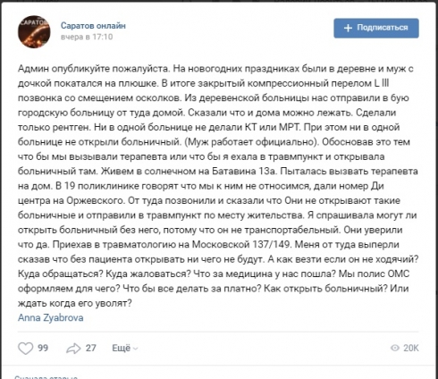 Страдает имидж учреждений медицинских, обращение публичное, хотелось бы официального комментария Минздрава в группе ВК Саратовонлайн по данной ситуации и на портале "Лица губернии".