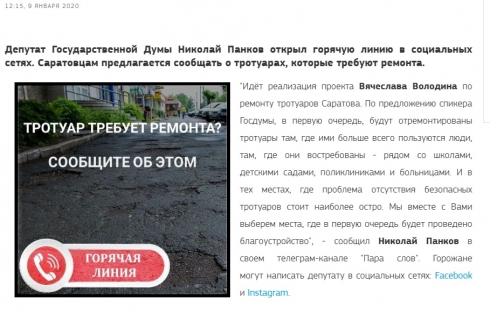 "Идёт реализация проекта Вячеслава Володина по ремонту тротуаров Саратова. По предложению спикера Госдумы, в первую очередь, будут отремонтированы тротуары там, где ими больше всего пользуются люди, там, где они востребованы - рядом со школами, детскими садами, поликлиниками и больницами. И в тех местах, где проблема отсутствия безопасных тротуаров стоит наиболее остро. Мы вместе с Вами выберем места, где в первую очередь будет проведено благоустройство", - сообщил Николай Панков в своем телеграм-канале "Пара слов". Горожане могут написать депутату в социальных сетях: Facebook и Instagram.