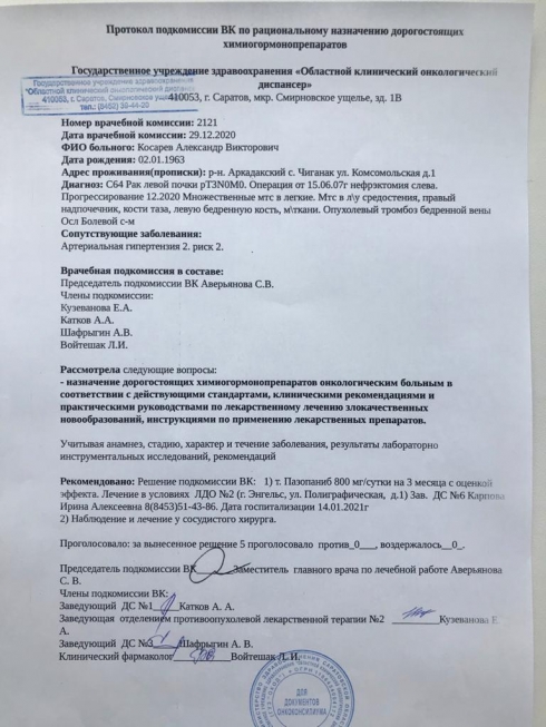 21.12.2020 года было произведено ПЭТ/КТ в г. Москва, ул. Профсоюзная, д. 86, стр.3, в результате которого выявлено метастазирование легких, правого надпочечника, левой бедренной кости.