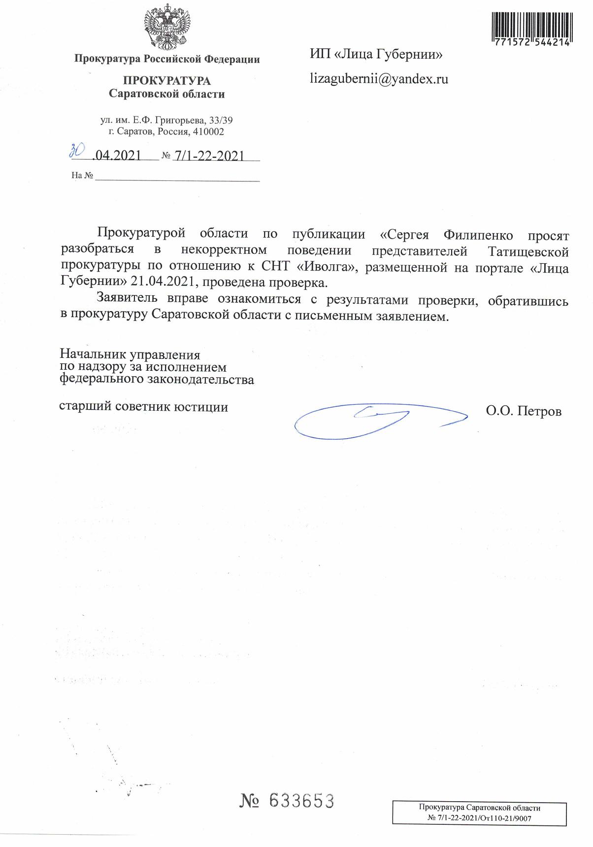 Прокурору Саратовской области