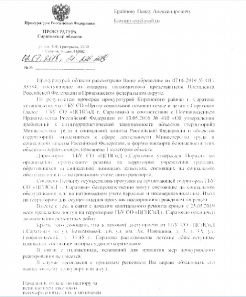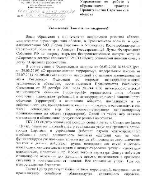 Просим Вас защитить права семей с детьми микрорайона на получение социальных услуг от Центра социальной помощи семье и детям г.Саратова (Зенитная 14).Материалы СМИ:https://www.4vsar.ru/news/centr-pomoschi-seme-i-detyam-148538/http://lizagubernii.ru/vopros/59500/galoba-na-protivopravnye-deistviya-dolgnostnyh-lic-mladencev-zapisali-v-terroristy.htmlЖалоба на противоправные действия должностных лиц МЛАДЕНЦЕВ ЗАПИСАЛИ В ТЕРРОРИСТЫ :: сайт «Лица Саратовской губернии» (lizagubernii.ru)Цитата из обращения Крайнова П.А :\"Там гуляли родители с маленькими детьми из всех ближайших домов, мы с удовольствием шли на встречу администрации центра и материально и физически помогали в благоустройстве площадки....До 2018 года........В качестве решения могу предложить, организовать в данном учреждении «занятия на свежем воздухе», куда мы запишем своих детей и предоставим свои документы, будем выходить гулять в определенные разрешенные часы, заходить на территорию по паспорту, вносить какую-то разумную ежемесячную оплату на нужды центра или услуги дворника…Готов рассмотреть любые варианты.\"В Паспорте социальных услуг от 09.01.2019 года ГБУ «Центр социальной помощи семье и детям г. Саратова» есть услуги в полустационарной форме, которые как потребитель и просит многодетный отец и другие жители микрорайонаhttp://semya-saratov.ru/perechen_uslug.pdfОсновными задачами психолого-педагогического отделения, входящего в структуру ЦСПСД, являются: оказание писхолого-педагогической помощи семьям, консультирование, а направления деятельности согласно Положения об ОППП 3.1-3.5 соответствуют запрашиваемым потребностям семей с детьми микрорайона, озвучиваемым Крайновым П.А.Поэтому просим обратиться в министерство труда и социального развития , чтобы оно как учредитель обязало ЦСПСД предоставлять следующие социальные услуги семьям с детьми микрорайона на территории ЦСПСД НА СВЕЖЕМ ВОЗДУХЕ в полустационарной форме согласно Паспорта соцуслуг:-проведение оздоровительных мероприятий;- проведение мероприятий, направленных на формирование здорового образажизни;- организация досуга, проведение клубной и кружковой работы для формированияи развития позитивных интересов.Спасибо заранее за защиту интересов семей с детьми, с уважением Сазонова Т.Н.