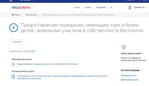 прописана постановка на учёт через Госуслуги для многодетных на получение земельного участка, но на данный момент эта услуга является неэлектронной
