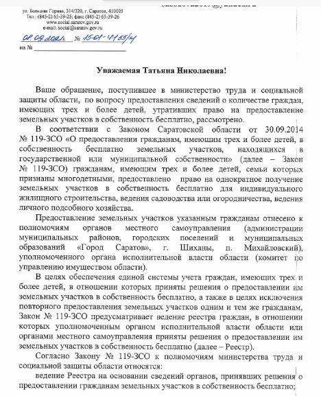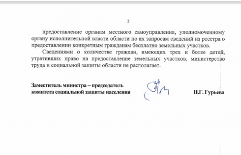 Я обращалась к Вам через данный портал и Вы мне не ответили на вопрос от 20 августа 2021 года о том, сколько многодетных семей потеряли право на получение в собсвтенность земельных участков с 2015 года.