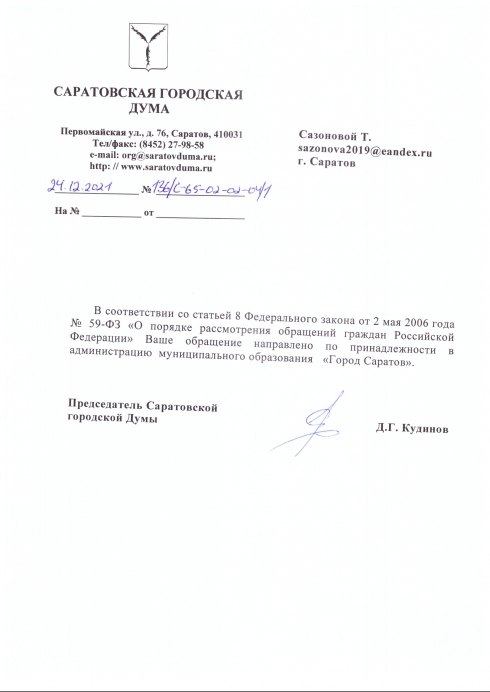 Ответ от 24 декабря считаю ответом не по существу и ,возможно, нарушается ФЗ-59 "О порядке рассмотрения обращений граждан РФ", Вы перенаправили обращение в администрацию МО "Город Саратов".