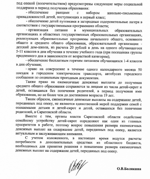 Пришёл ответ за подписью О.В. Болякиной, возможно, являющийся ответом не по существу на обращение о необходимости внесения изменений в областное законодательство для детей-сирот, лиц из их числа и детей, оставшихся без попечения родителей, которые поступили на обучение в учреждения СПО на платной основе.