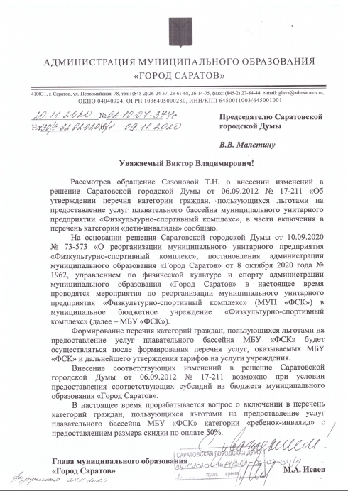 Добрый вечер. Проект изменений в решение Саратовской городской Думы, предусматривающий добавление в перечень льготных категорий граждан («ребенок-инвалид» и сопровождающие их лица), которые пользуются возможностью посещать бассейн «Саратов», в настоящее время находится на согласовании после доработки. В феврале запланировано внесение проекта на рассмотрение Саратовской городской Думы.