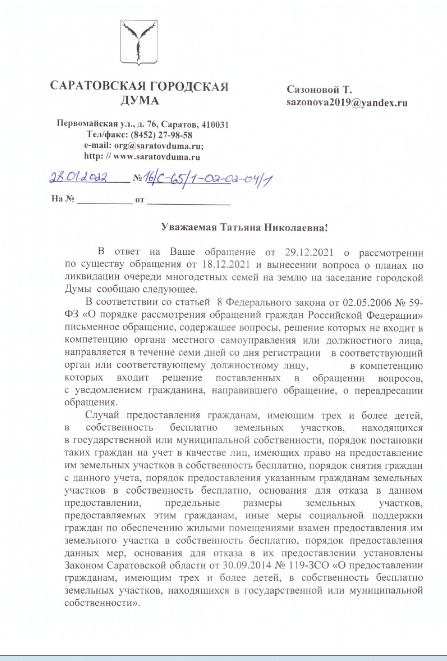 Поэтому и просила ВЫНЕСТИ НА ЗАСЕДАНИЕ ГОРОДСКОЙ ДУМЫ ВОПРОС О ПЛАНАХ ПО ЛИКВИДАЦИИ ОЧЕРЕДИ МНОГОДЕТНЫХ СЕМЕЙ НА ЗЕМЛЮ: