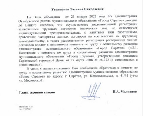 Добрый день. Комитет по труду и социальному развитию администрации муниципального образования «Город Саратов» осуществляет уведомительную регистрацию заключенных трудовых договоров физических лиц, не являющихся индивидуальными предпринимателями, с нанятыми работниками, проводит экспертизу договоров на соответствие трудовому законодательству, а также уведомительную регистрацию расторжения данных договоров.