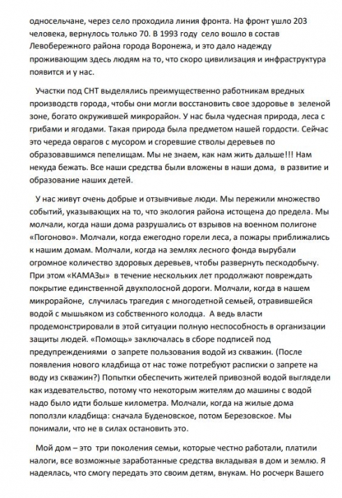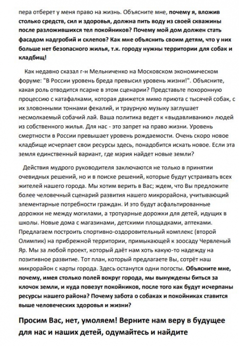 Уважаемый Николай Николаевич! Помогите нам! Мы собрали 1116 подписей местных жителей с требованием отмены создания на территории нашего микрорайона приюта и кладбища. Письмо передали нашему региональному депутату. У людей отчаяние! Мы будем рады любой помощи.
