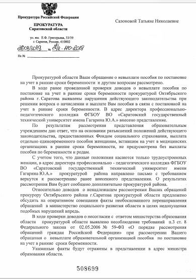 Прилагаю ответ прокуратуры по вопрсоу нарушения академических прав студента с представлениями в адрес колледжа и министра образования Седовой И.В. из-за непринятия мер по контролю за соблюдением академических прав студента колледжа.