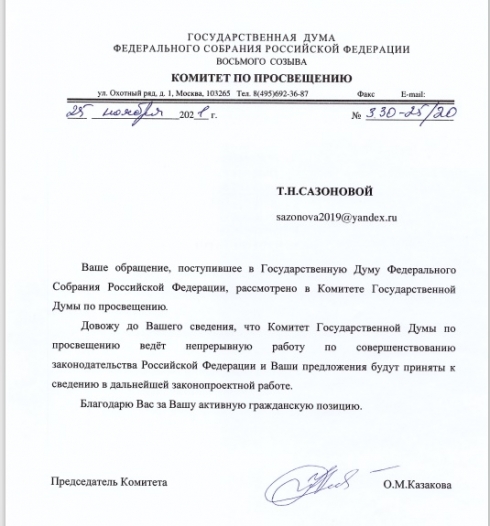Обращение к Вам передали на рассмотрение Казаковой О.М.-председателю Комитета по просвещению и 25 ноября 2021 она сообщила, что наше предложение будет принято в дальнейшей законопроектной работе.