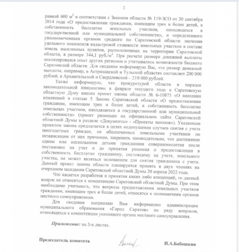 Вы отписали наше обращение Бабошкину И.А., председателю комитета по аграрным вопросам, земельным отношениям и природопользованию. Ответ Бабошкина И.А, от 19 апреля 2022 года, возможно, является ответом НЕ ПО СУЩЕСТВУ. Прошу Вас проверить ответ, так как он касается 9000 многодетных семей.