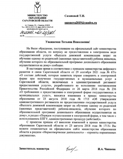 Добрый день! В соответствии с п.53 плана-графика перевода государственных услуг Саратовской области в электронный формат, утвержденного министерством цифрового развития и связи Саратовской области, обеспечение возможности для заявителей представлять документы в электронном виде с использованием ЕПГУ в целях получения государственной услуги «Выплата денежной компенсации затрат на обучение одному из родителей (законных представителей) ребенка инвалида, обучение которого по образовательной программе дошкольного образования осуществляется на дому» (далее – Услуга) и осуществлять мониторинг хода предоставления услуги в электронном виде запланировано на ноябрь 2022 года.В настоящее время Услуга в электронном формате не оказывается, министерством образования Саратовской области вносятся изменения в приказ министерства образования от 23 августа 2018 года № 1713 в раздел «Порядок осуществления в электронной форме, в том числе с использованием ЕПГУ, административных процедур (действий)» в целях приведения в соответствие с постановлением Правительства Саратовской области от 26 августа 2011 года № 458-П.