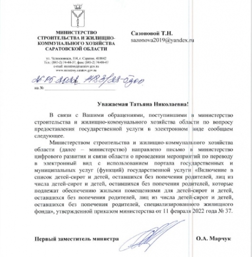 Как мы поняли. вопрос цифровизации Вы поднимаете перед министерством цифрового развития и связи, а планируется ли внесение изменений в Административный регламент № 37 от 11 февраля 2022 в части возможности подачи пакета докуметов в МФЦ и ЕПГУ для получения услуги «Включение в список детей-сирот и детей, оставшихся без попечения родителей, лиц из числа детей-сирот и детей, оставшихся без попечения родителей, которые подлежат обеспечению жилыми помещениями для детей-сирот и детей, оставшихся без попечения родителей, лиц из числа детей-сирот и детей, оставшихся без попечения родителей, из специализированного жилищного фонда»?