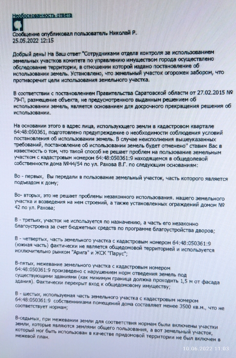 На Ваш ответ от 26.05.2022 в 18:55 "Добрый вечер. Для того, чтобы детально разобраться в сложившейся ситуации, рекомендую Вам записаться на личный прием к моему профильному заместителю - Алексею Никитину или председателю комитета по управлению имуществом города Светлане Чеконовой. Сделать это можно, обратившись в отдел по работе с обращениями граждан администрации Саратова по телефону (8452) 26-02-49 (режим работы с 09.00 до 18.00 в рабочие дни)"