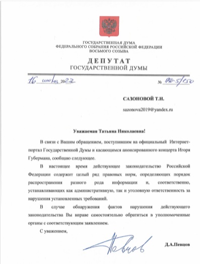 В ОБРАЩЕНИИ ПРОСИЛА ВАС ПОДНЯТЬ ВОПРОС И ОБРАТИТЬСЯ В ФСБ И МВД О ЗАПРЕТЕ ВЪЕЗДА ГУБЕРМАНУ И.М. В РФ! Многолетняя проукраинская пропаганда им ведётся и всяческое отрицание укрофашизма, но почему-то продаются его концерты в Москве.