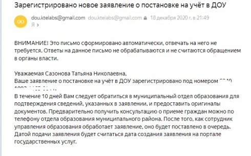 ВНИМАНИЕ! Это письмо сформировано автоматически, отвечать на него не требуется. Ответы на данное письмо не обрабатываются и не считаются обращением в органы власти."Ваше заявление о постановке на учёт в ДОУ зарегистрировано под номером ///////////В течение 10 дней Вам следует обратиться в муниципальный отдел образования для подтверждения сведений, указанных в заявлении, и предоставить оригиналы документов. Предварительно получить консультацию о приеме граждан можно по телефону отдела образования муниципального района. После того, как сотрудник управления образования обработает заявление, оно будет поставлено в очередь.Датой подачи заявления будет считаться дата создания заявления на портале государственных услуг."
