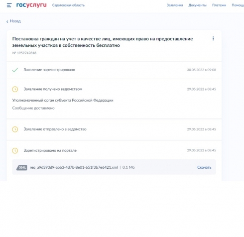 Добрый день. В рамках рассмотрения Вашего заявления от 30.05.2022 распоряжением комитета по управлению имуществом города Саратова Вы поставлены на учет граждан, имеющих трех и более детей, в целях дальнейшего предоставления земельного участка. Обращаю внимание, что администрация муниципального образования "Город Саратов" и комитет по управлению имуществом города Саратова не являются администраторами Единого портала государственных и муниципальных услуг, поэтому сообщить о причинах отсутствия информации в личном кабинете заявителя не представляется возможным. Распоряжение повторно размещено на Портале.