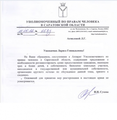 Прошу Вас изучить ответ Алфериной Марии Георгиевны, Начальника отдела защиты земельных и экологических прав Аппарата Уполномоченного по правам человека РФ, которая нашла основания для реагирования там, где Вы этих оснований не нашли! Алферина М.Г. отправила в прокуратуру Саратовской области моё обращение по вопросу ликивидации очереди многодетных семей на землю. Спасибо ей за неравнодушие к этой проблеме многодетных семей области и г. Саратова.