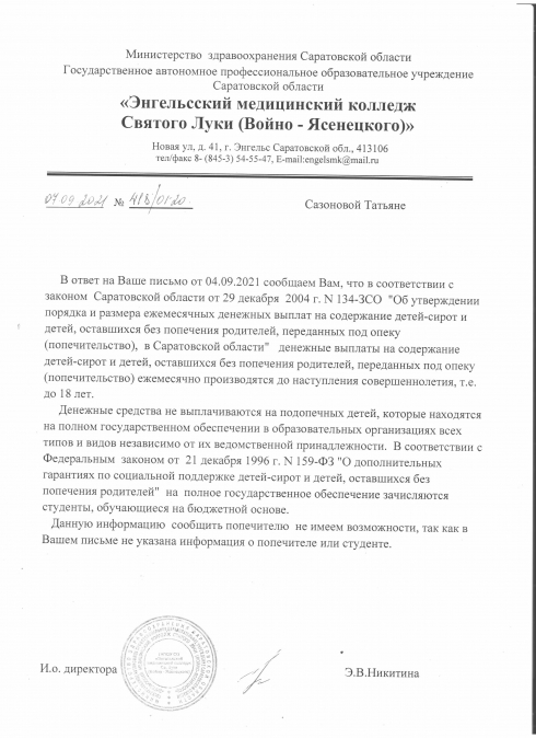 Прошу направить в адрес министерства здравоохранения области информацию об особом внимании к абитуриентам-сиротам или детям, оставшимся без попечения родителей, чтобы не повторилось ситуации с ребёнком, оставшимся без попечения, когда она на платной основе учиться была вынуждена, не пройдя на бюджет в Энгельсский колледж. родителей опека и пособия :: сайт «Лица Саратовской губернии» (lizagubernii.ru),