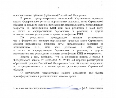 Прилагаю ответ за вашей подписью от 15 июля 2022 года по вопросу наличия приказов минздрава области о графике дезинфекций роддомов и маршрутизации беременных и рожениц.