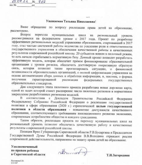 Из Вашего ответа от 15 июля 2022 года мы не совсем поняли Вашу позицию: Вы полностью поддерживаете такой поэтапный перевод и критерии отбора некоторых школ на региональный уровень?