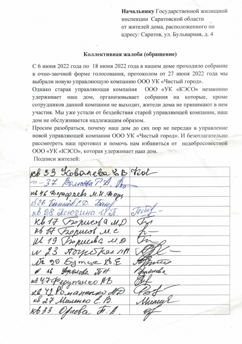 Просим разобраться, почему наш дом до сих пор не передан в управление новой управляющей компании ООО УК «Чистый город». Безотлагательно рассмотреть наше обращение и помочь нам избавиться от недобросовестной ООО «УК «КЭСО», которая удерживает наш дом.