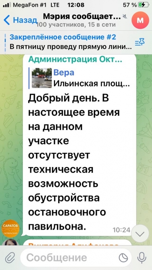 Обращались саратовцы на данном портале , в соцсетях к Молчанову И.А. и в прямом эфире в ВК. об остановочном павильоне на Ильинской площади, чётная сторона.