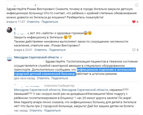 Минздрав Саратовской области, Минздрав Саратовской области, серьезно???? Авиацией??? У нас скорую иной раз не дождёшься!Насмешили! Мою подругу с ребёнком госпитализировали в Елшанку! 1 час 25 минут дорога заняла! По жаре!Мне педиатр вчера лично сказала, что инфекционных больниц для детей в Энгельсе нет! Что была при 2 городской больнице, закрыта! Дай бог вашим детям не болеть