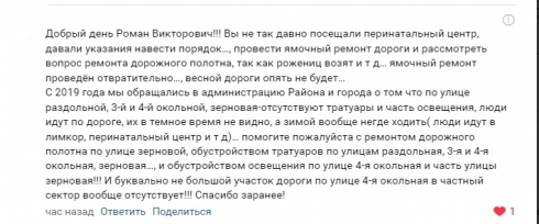 "Добрый день Роман Викторович!!! Вы не так давно посещали перинатальный центр, давали указания навести порядок…, провести ямочный ремонт дороги и рассмотреть вопрос ремонта дорожного полотна, так как рожениц возят и т д… ямочный ремонт проведён отвратительно…, весной дороги опять не будет…С 2019 года мы обращались в администрацию Района и города о том что по улице раздольной, 3-й и 4-й окольной, зерновая-отсутствуют тратуары и часть освещения, люди идут по дороге, их в темное время не видно, а зимой вообще негде ходить( люди идут в лимкор, перинатальный центр и т д)… помогите пожалуйста с ремонтом дорожного полотна по улице зерновой, обустройством тратуаров по улицам раздольная, 3-я и 4-я окольная, зерновая…, и обустройством освещения по улице 4-я окольная и часть улицы зерновая!!! И буквально не большой участок дороги по улице 4-я окольная в частный сектор вообще отсутствует!!! Спасибо заранее!"