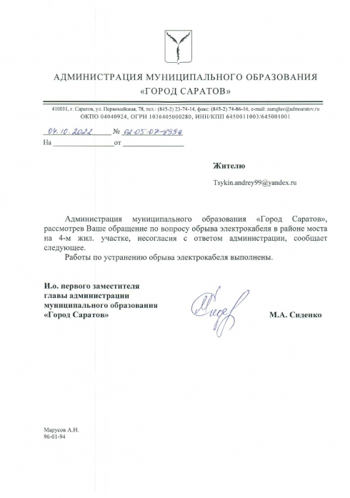 Здравствуйте. Уже на протяжении 5 месяцев на мосту между Радугой и 4м жил.участком кабель лежит на кустах. Администрация заводского района не реагирует и пишет отписки о якобы устраненных обрывах, но на этом участке видимых обрывов не было (ответ в приложении). Администрация города саратова так же не реагирует и пишет отписки о якобы устраненных обрывах (ответ в приложении). Ждут ли они, когда произойдет ЧП или что должно произойти, чтобы они обратили на это внимание?