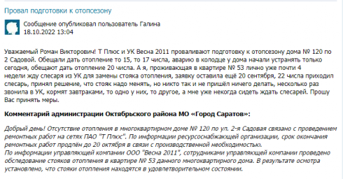 Комментарий администрации Октябрьского района МО "Город Саратов":