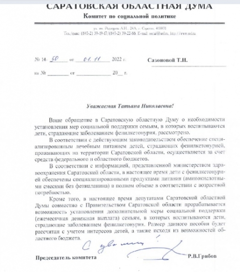 Обращались к Вам на данном портале 30 сентября 2022 года ,а также официально через сайт областной Думы с просьбой разработать НПА по мерам соцподдержки для детей с ФКУ в части обеспечения безбелковыми продуктами.