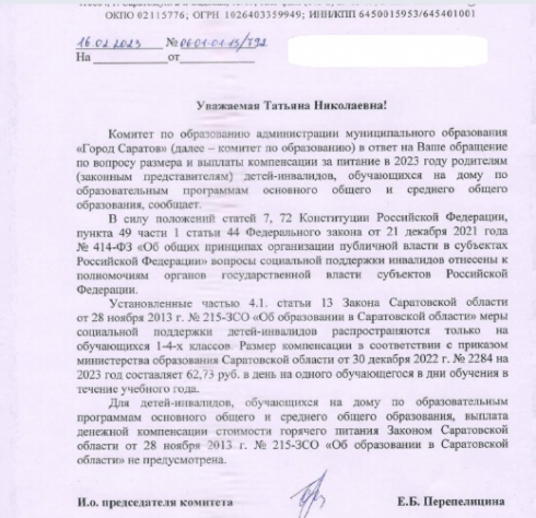 С сентября 2023 года не предоставляется бесплатное питание детям с ОВЗ, обучающимся в муниципальных школах г. Саратова.