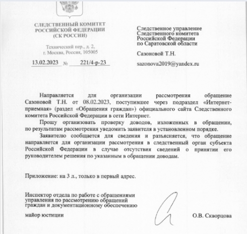 Номер нашего обращения в СК РФ 08.02.2023 года