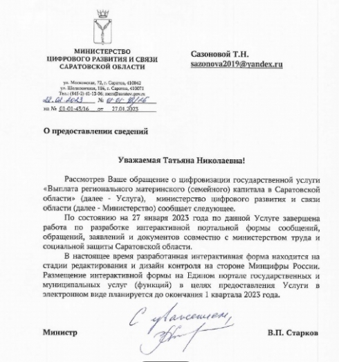Спасибо за исчерпывающий ответ по цифровизации услуги "Выплата регионального материнского (семейного) капитала в Саратовской области".