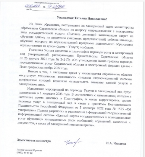 Мы обращались в прокуратуру в 2022 году, так как обнаружили, что услуга в цифровом виде не предоставляется "Выплата денежной компенсации затрат на обучение одному из родителей (законных представителей) ребенка-инвалида, обучение которого по образовательной программе дошкольного образования осуществляется на дому"