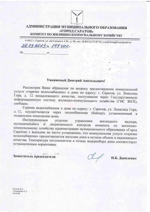 Добрый день! В ходе обследования многоквартирного дома по адресу: г. Саратов, ул. Лопатина Гора, д. 12 инспекционным отделом управления жилищного надзора, муниципального и лицензионного контроля комитета по жилищно-коммунальному хозяйству администрации муниципального образования «Город Саратов» 06.03.2023 с выходом на место установлено, что температура теплоносителя, подаваемого ресурсоснабжающей организацией ООО «ТЭГК» на вводе в дом составляла Т1 = 72,7 °C, Т2 = 56,3 °C. Температура теплоносителя на горячее водоснабжение после бойлера на момент проверки составляла 65,8 °C, что позволяло обеспечивать нормативные показатели теплоносителя в точка водоразбора жилых помещений многоквартирного дома (норматив не ниже +60 °С и не выше +75°С). Допустимое отклонение температуры горячей воды в точке водоразбора от нормативной: в ночное время (с 0.00 до 5.00 часов) - не более чем на 5 °C; в дневное время (с 5.00 до 00.00 часов) - не более чем на 3 °C.