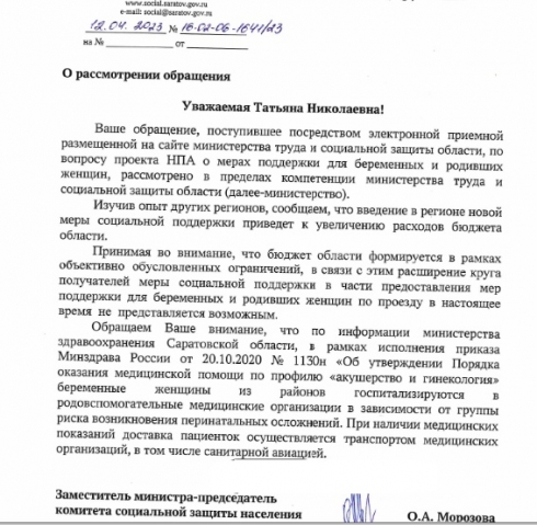 Ответ замминистра труда и соцзащиты СО Морозовой О.А. от 12 апреля 2023 года содержит информацию, что областной бюджет ограничен и нельзя расширить меры соцподдержки беременных и родивших женщин.