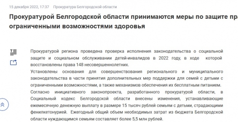 _________________________________________________"Согласно инициативного законопроекта, разработанного прокуратурой области, в Социальный кодекс Белгородской области внесены изменения, устанавливающие ежемесячную денежную выплату в размере 15 тысяч рублей семьям с детьми, страдающими фенилкетонурией. Ежегодный общий объем необходимых затрат из бюджета Белгородской области нуждающимся семьям составляет более 5,5 млн рублей."