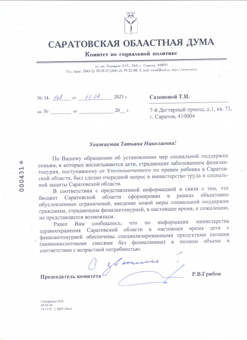 Уважаемая Татьяна Николаевна! Обращались к Вам по нарушению прав детей с ФКУ: минздрав области предоставляет только смеси АКС, но в 890 Постановлении Правительства РФ от 30.07.1994 указаны и безбелковые продукты, не только гидролизаты(смеси АКС). О проблеме мы узнали из-за обращений родителей детей с ФКУ к губернатору перед прямой линией. Вы передали обращение к Вам Исаеву М.А. 9 марта, ответа нет.http://lizagubernii.ru/vopros/63551/zagorodnyaya-tn-obratilas-k-vam-v-zashitu-prav-detei-s-fku-spasibo-tatyane-nikolaevne.html Мы в свою очередь обратилась в СУ СК РФ по Саратовской области R64N8094 22.02.2023 года, идёт проверка, результатов пока нет. Просим изучить недавний пример действий по защите прав детей с ФКУ прокуратуры Белгородской области, в декабре 2022 года она стала инициатором законопроекта по поддержке детей с ФКУ. https://epp.genproc.gov.ru/web/proc_31/mass-media/news?item=73265682 Просим Вас обратиться к прокурору области Филипенко Сергею Владимировичу, с предложением инициации прокуратурой области внесения в Саратовскую областную Думу законопроекта о мерах допподдержки детей с ФКУ в части обеспечения безбелковыми продуктами.СПАСИБО ЗАРАНЕЕ ЗА ЗАЩИТУ ПРАВ ДЕТЕЙ -ИНВАЛИДОВ И ДЕТЕЙ С ОВЗ!